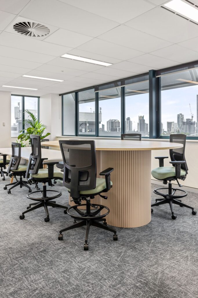 The council’s offices feature open-plan spaces complemented by meeting rooms, focus areas and communal spaces, all designed to foster a work environment that is both efficient and inspiring. Burgtec delivered the entire furniture and workstation package for the first six floors, including offices, meeting rooms, breakout and kitchen areas, tables, chairs and booth seating. The highly bespoke solution featured unique materials, upholstery and powder-coated finishes matched across a substantial quantity of workstations, tables and chair frames. Around 60 line items in a typical specification were multiplied by three colour palettes, creating hundreds of custom variations. As always, Burgtec delivered precision in documentation, production and quality assurance. Most valuable to the client was Burgtec’s ability to keep to the tendered price despite evolving specifications and design refinements during construction.